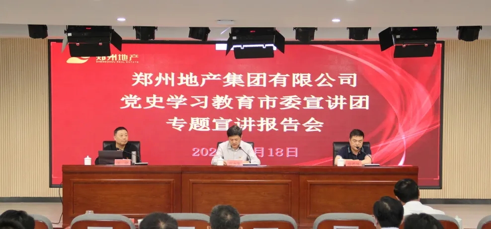 為持續(xù)推進黨史學(xué)習(xí)教育走深走實,5月18日上午,鄭州市委宣講團走進鄭州地產(chǎn)集團,在集團301多功能廳開展黨史學(xué)習(xí)教育專題宣講報告會。報告會由鄭州市委宣講團成員、鄭州工程技術(shù)學(xué)院馬克思主義學(xué)院副教授張豪主講,市國資黨史學(xué)習(xí)教育第二巡回指導(dǎo)組組長、四級調(diào)研員段德強,指導(dǎo)組成員張詩雨、陳祥斐到會巡聽旁聽,地產(chǎn)集團領(lǐng)導(dǎo)班子、總部全體員工,各子公司支部書記、黨建部門負(fù)責(zé)人等共計150余人參加現(xiàn)場報告會,各子公司員工共計170余人通過線上直播進行觀看,會議由地產(chǎn)集團黨委書記、董事長萬永生主持。