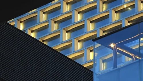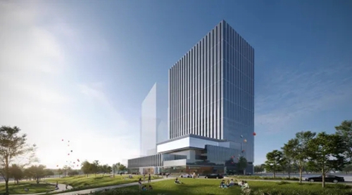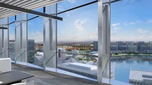 城發(fā)中心以“嵩山書(shū)頁(yè)巖”為設(shè)計(jì)理念,以中空LOW-E玻璃打造極簡(jiǎn)幕墻立面,玻璃寬約3米,隱藏式開(kāi)啟窗。