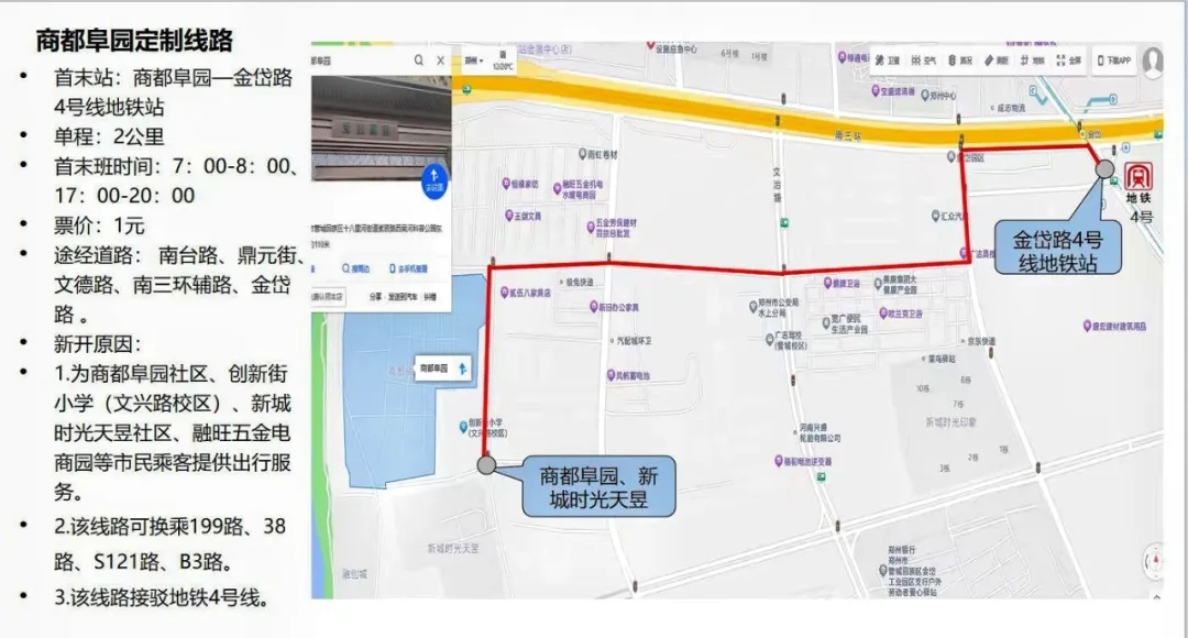 專線開(kāi)通后,商都阜園項(xiàng)目租戶及業(yè)主實(shí)現(xiàn)了“出門即坐上公交,下車即地鐵口”的通勤效率新格局。線路途徑南臺(tái)路、鼎元街文德路、南三環(huán)輔路;中途包含超市、理發(fā)店、小商品城等便民商業(yè)點(diǎn)。無(wú)論是上班還是購(gòu)物,都能享受到高效、舒適的出行體驗(yàn)。線路單程2公里,除直達(dá)地鐵口外也可換乘199路、38路、S121路、B3路。不僅解決了租戶的通勤難題,也為周邊社區(qū)居民提供了便利,得到了大家的一致好評(píng)。