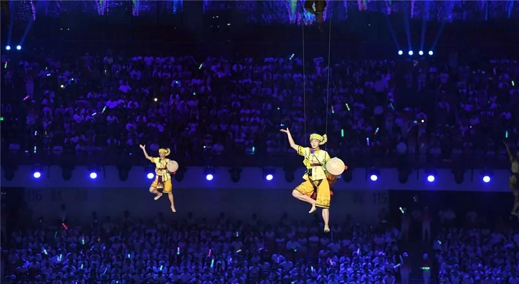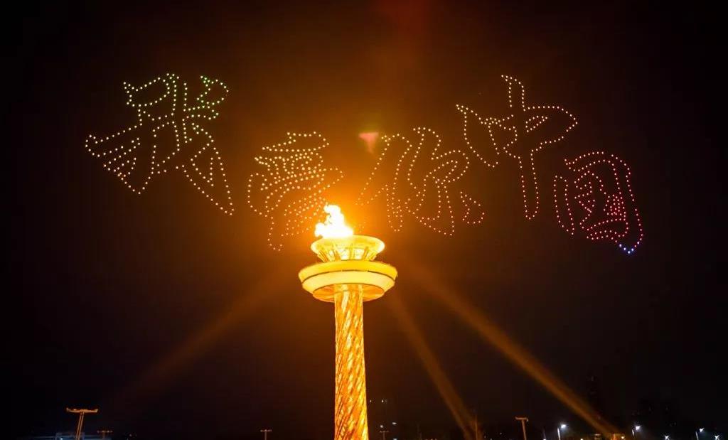 當(dāng)現(xiàn)場屏幕通過虛擬技術(shù)應(yīng)用,呈現(xiàn)出美麗的畫面,讓現(xiàn)場觀眾仿佛置身北國北川、南嶺飛瀑之中,觀眾都情不自禁地?fù)]舞起了手中的國旗為他們的表演喝彩!為我們偉大的祖國喝彩!1000架無人機(jī)從奧體中心廣場升起迅速變換成中中的造型,點(diǎn)燃民族運(yùn)動(dòng)會(huì)的火炬。