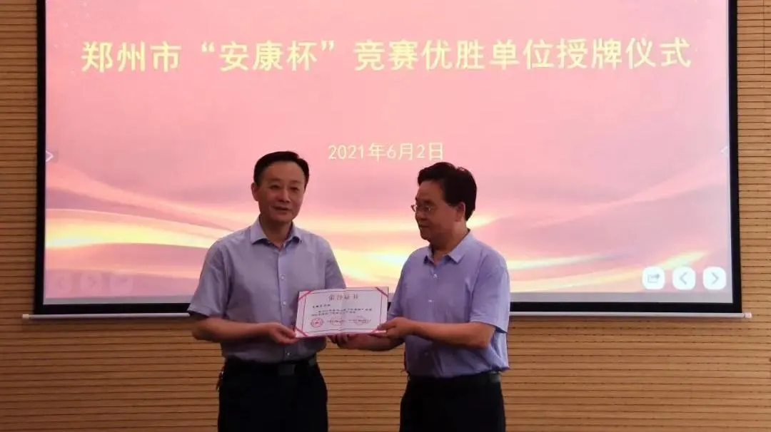 6月2日下午,鄭州市總工會(huì)機(jī)關(guān)工會(huì)主任王銀倉、市總工會(huì)勞動(dòng)和經(jīng)濟(jì)部部長宋慧分別向集團(tuán)兩家獲獎(jiǎng)公司頒發(fā)鄭州市“安康杯”競賽優(yōu)勝單位獎(jiǎng)牌。